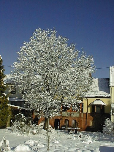Die Wahl für dieses Haus fiel nicht schwer nachdem wir den Garten sahen. Ein gewaltiger Walnussbaum beschattet das Wohnhaus von der Südseite. Das Winterfoto gibt einen sehr guten Blick auf die Gartenseite unseres Hauses.